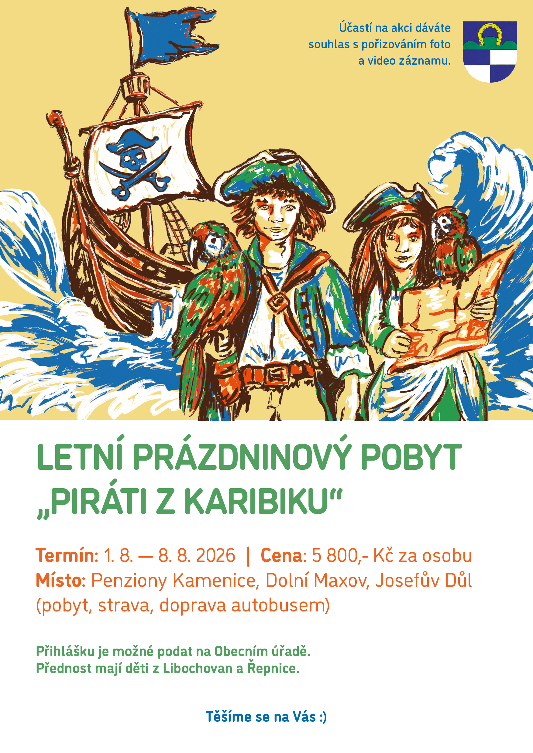 LETNÍ PRÁZDNINOVÝ POBYT 12.3.2026 Vystavil: Jitka Medunová Sdílet Sdílet Klikněte pro zkopírování URL Facebook Letní prázdninový pobyt ,,Piráti z Karibiku" se uskuteční od 1. 8. - 8. 8. 2026.Cena pobytu je 5.800,-Kč za osobu.