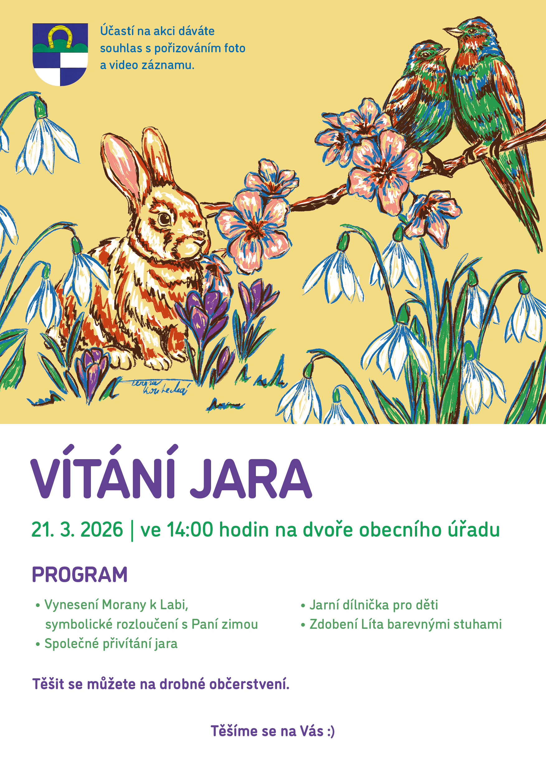 VÍTÁNÍ JARA 2026 12.3.2026 Vystavil: Jitka Medunová Sdílet Sdílet Klikněte pro zkopírování URL Facebook Program:Vynesení Morany k LabiSpolečné vítání jaraJarní dílnička pro dětiZdobení Líta barevnými stuhami