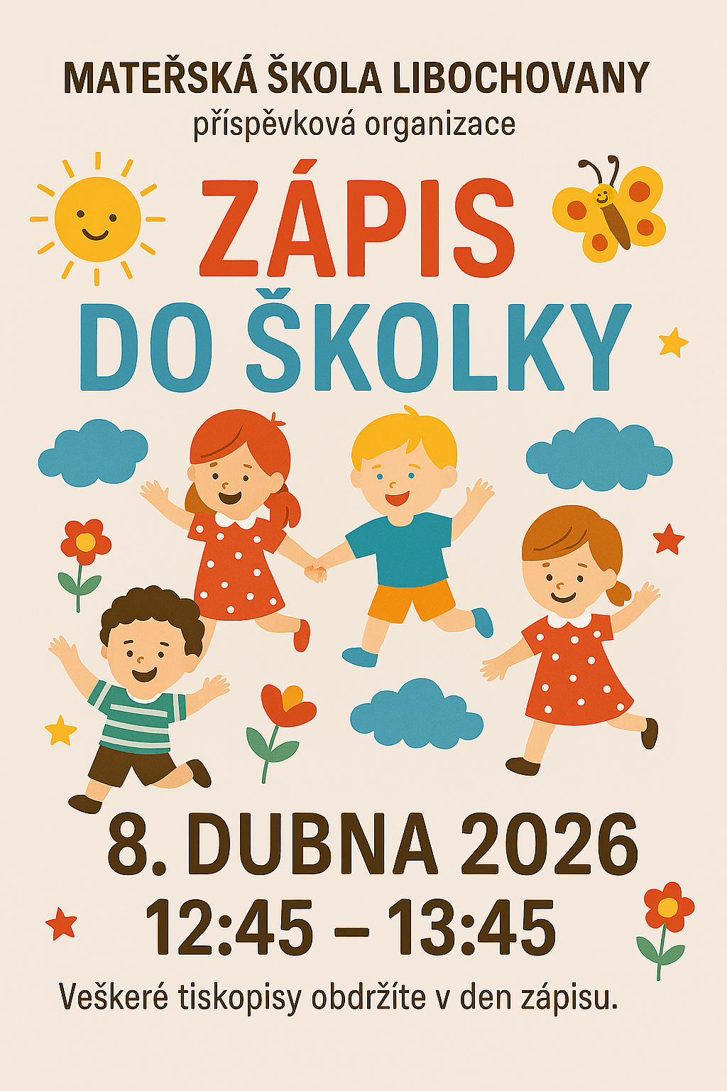 Zápis do Mateřské školy 2026 5.3.2026 Vystavil: Michal Melen Sdílet Sdílet Klikněte pro zkopírování URL Facebook 08.04.2026, 12:45 - 13:45Více informací v přiloženém letáku